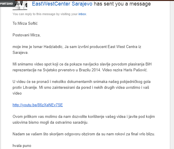 Pored potpuno blesavih pravila s muzikom, gdje ne smijete postaviti nešto što se očigledno nikad neće zaustaviti, i gdje vas lopovi optužuju da nešto kradete, desila mi se još jedna interesantna situacija. U oktobru 2013. godine sam prisustvovao utakmici Litvanija – BiH, te sam istorijski gol Vedada Ibiševića snimio dok sam stajao iza gola. To je jedini takav snimak, i pregledan je mnogo puta na YouTubeu. Nakon toga mi se javio zastupnik Harisa Pašovića, Ismar Hadžiabdić, i pitao da li East West Centar smije koristiti moj video kako bi napravili klip u kom će se pokazati navijačko slavlje povodom plasmana reprezentacije na Svjetsko prvenstvo. Ismar je takođe naglasio da su oni zainteresovani da, pored nekih drugih klipova, uvrste i ovaj. Ne sumnjajući u loše namjere ovog državnog režisera, pristao sam i poslat mi je ugovor koji se prilično razlikovao od ovoga što mi je napisano u poruci na YouTubeu. Pošto je ugovor poslovna tajna, neću pričati o njegovim detaljima, ali ću samo reći da me Pašović itekako prevario, te za 200 KM za kojih je dobio video, zaradio je mnogo, mnogo, mnogo više. Nije bilo nikakvih drugih klipova kako je obećano, nego samo moj, a drugi klipovi su ustvari bili golovi drugih reprezentacija, a tako nije rečeno.