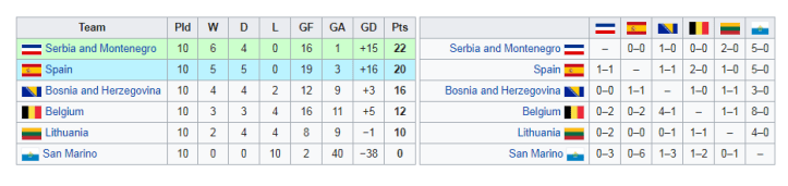 Ponovo smo ostali u četvrtom šeširu i bili izvučeni da igramo s Belgijom, Španijom i Srbijom i Crnom Gorom. Svjetsko prvenstvo se činilo dalje nego ikad. Ipak, pod vođstvom Bake Sliškovića, i iz ove perspektive, uspjeli smo odigrati odlične kvalifikacije, ali za neke stvari jednostavno nije bilo sreće. Kada se sve sabere i oduzme, tabela je na kraju izgledala veoma nesretno po nas, jer se protiv nekih stvari nismo mogli boriti. Španjolci su nam dali izjednačujući gol na Mestalji u 96. minuti (a ne u stotoj, kako volimo reći), a SCG pobijedila u nenormalnoj atmosferi, gađajući nas topovskim udarima. Sa recimo samo po jednim golom više na te dvije utakmice, ili eventualno po jednim golom manje u našoj mreži, bili bismo možda i prvi u grupi u takvoj konkurenciji. Uspjeli smo iza sebe ostaviti Belgiju, što je svakako uspjeh više u odnosu na prethodni period. Tada nismo ni sanjali da će nam trebati još osam dugih godina do prvog i zasad jedinog takmičenja. I pored dobrih rezultata, ostali smo u prokletom četvrtom šeširu.